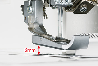 Zdvih přítlačné patky až 6 mm – více prostoru pod patkou pro silné látky, více vrstev a vysoké švy . Přešívání lemů a přechodů je snazší a plynulejší , materiál máte lépe pod kontrolou a práce je rychlejší i u objemných projektů.