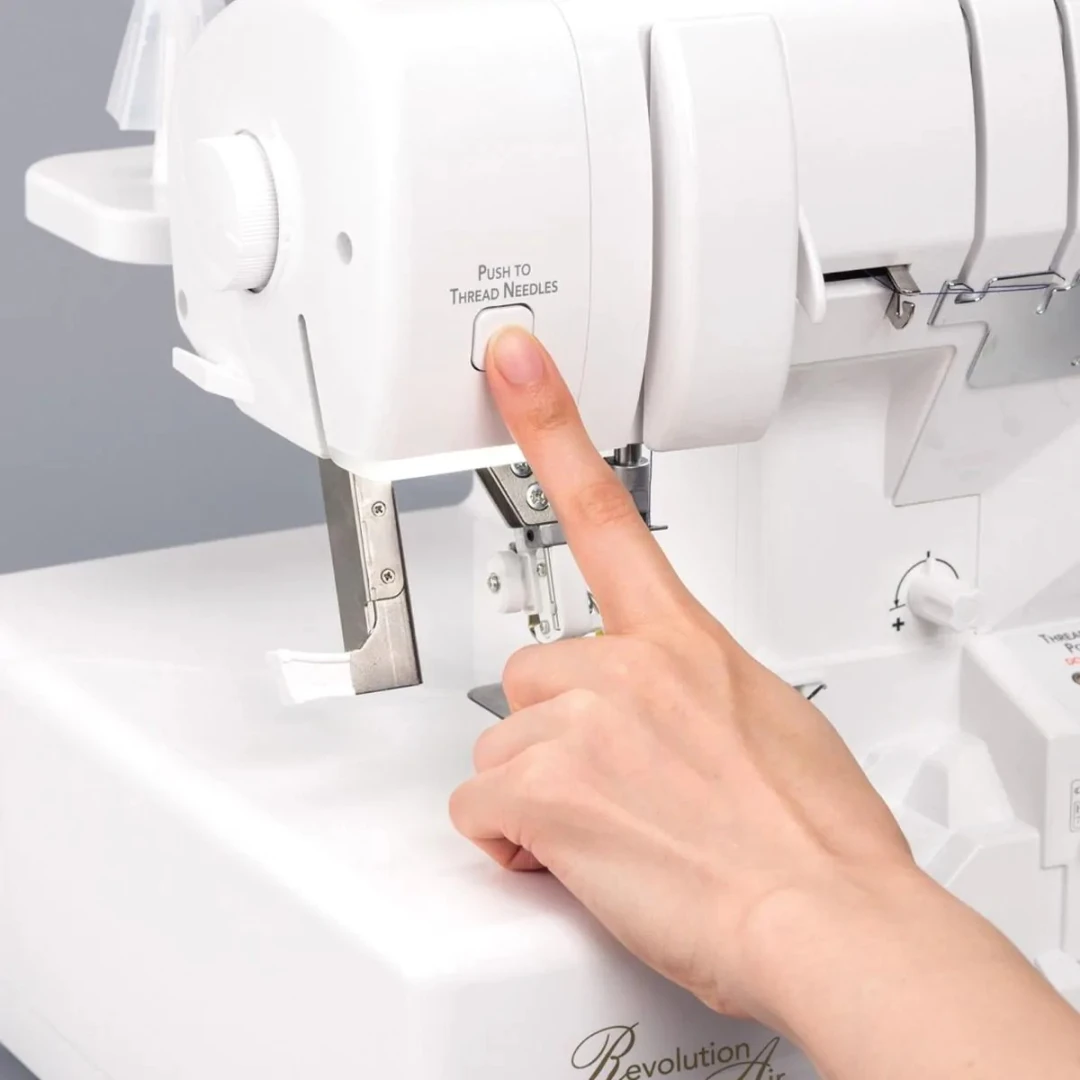 Navlékání jehel pomocí systému RevolutionAir™ vám vždy usnadní a urychlí přípravu stroje. Stačí nasadit navlékač, stisknout tlačítko a jehly modelu Acclaim jsou během okamžiku navlečeny. Nit přiložená k očku jehly je jemným proudem vzduchu protažena přímo skrz očko – rychle, jednoduše a maximálně pohodlně.